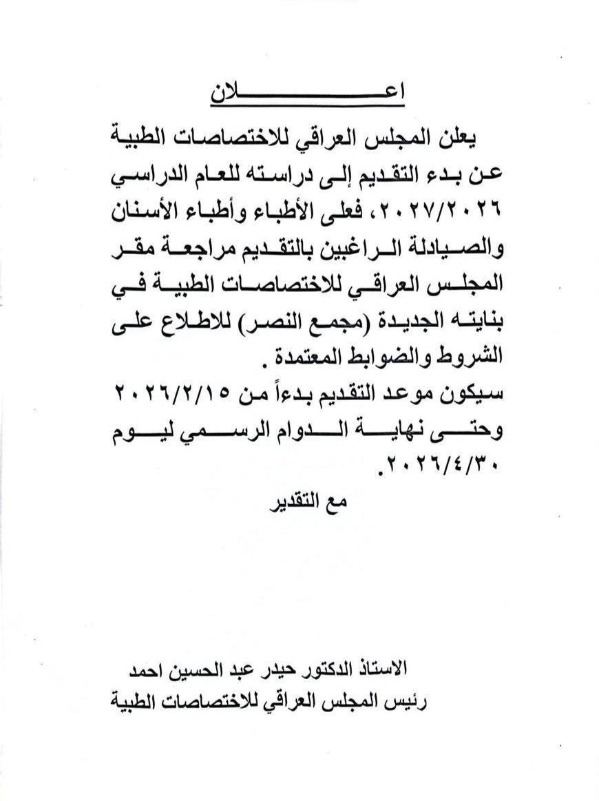 يعلن المجلس العراقي للاختصاصات الطبية عن بدء التقديم الى دراسته للعام الدراسي 2026-2027